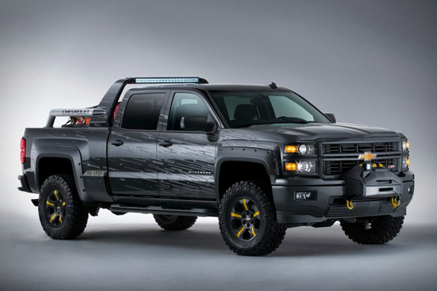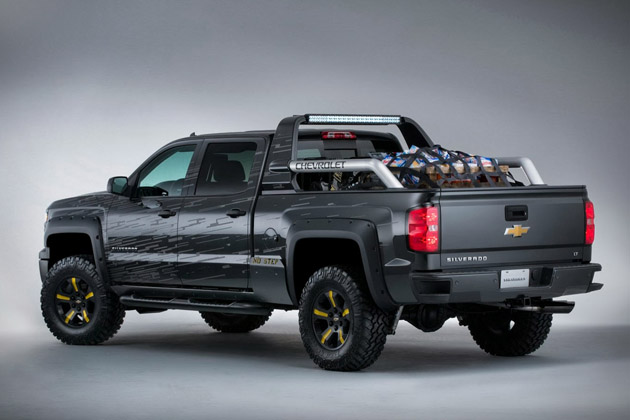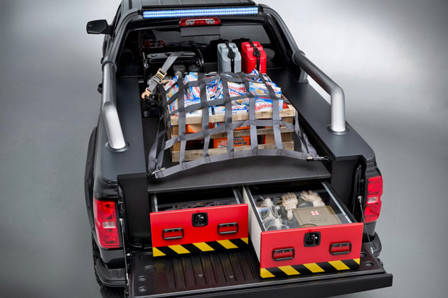 The Black Ops is sinister-looking based on a Silverado 1500 Crew Cab 4×4. The concept features a black exterior paint combined with custom-fabricated lower body armor, and a lockable, a bed-mounted Truck Vault storage unit. The concept also features a solar power pack, a pair of gas masks, gloves, military first aid kit, a folding shovel and rope.