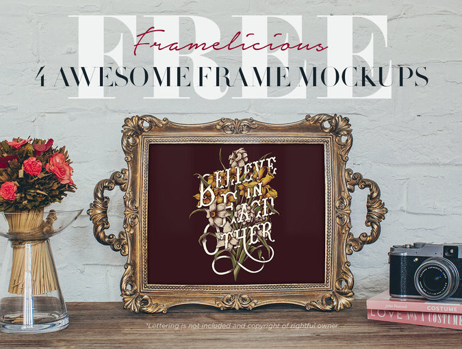 Show case you next work-of-art with the Framelicious mockup, 4 real photo frames. All included Smart objects for easy inserting your own design. More photo frames are available here.