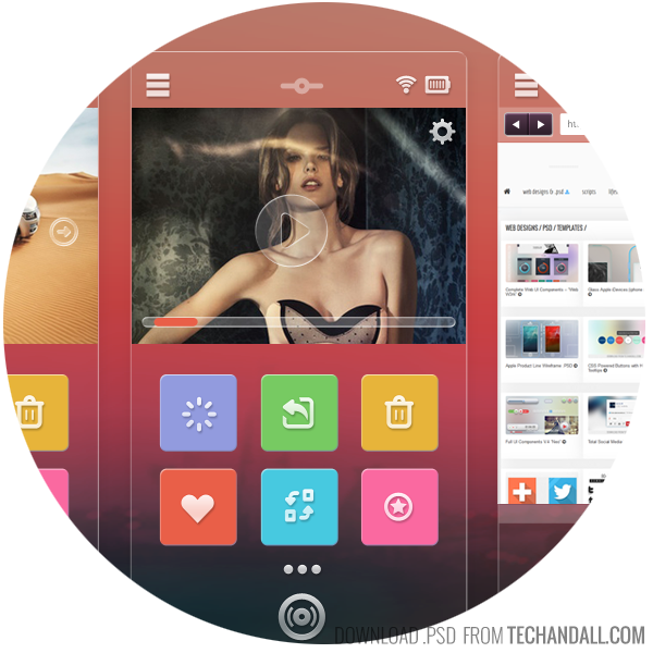 Here is a cool mobile UI concept I came up with using some flat color schemes which includes photo gallery, web browser, video player, and the home screen. I went with the minimalist approach, keeping the layout on a glass like surface with some colorful call to action icons. All shape are vector so you can re-size them as you please.